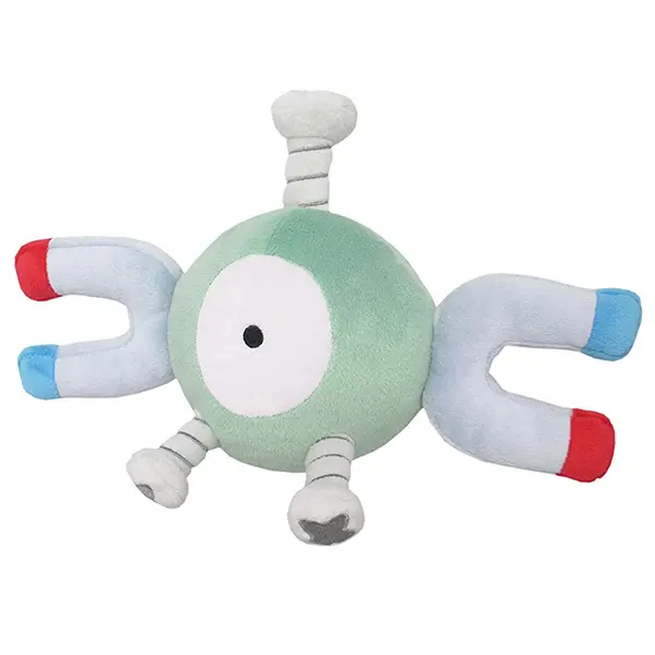 Magnemite is a seemingly robotic Pok?mon that has a gray, spherical metal body with blue-and-red tipped horseshoe magnets on each side and a single, large eye. It has three Phillips head screws on its body: two near the bottom of its body and the one on top of its head that looks similar to an antenna. The two bottom screws serve no noticeable purpose, although they may be its feet as the Pok?dex identifies a footprint similar to that of the screw’s head. Even though Magnemite and its evolved forms are mechanical creatures, the anime has shown that it has emotions and a way of reproducing. It has even exhibited the need to eat, although its main form of nutrients is electrical currents. It is commonly found in locations such as power plants or caves with a strong magnetic field. Despite its modern, artificial appearance, Magnemite has been depicted in carvings discovered at the Ruins of Alph and has been present in AZ’s retelling of the Kalos war, indicating it has existed for at least 3,000 years.